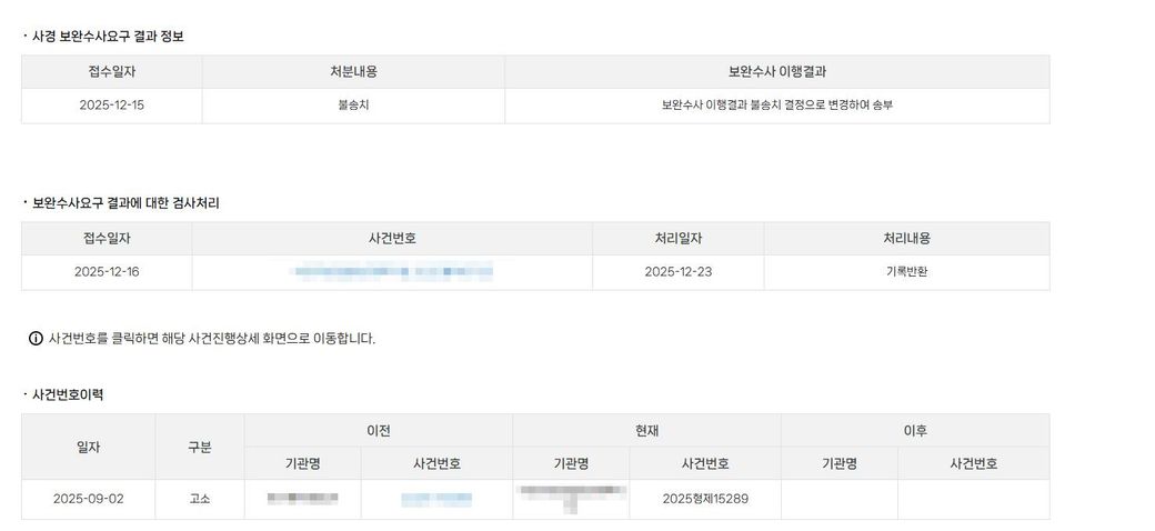 제목 그대로 사건이 진행되었는데 사진 첨부한대로 사건이 조회가 되더라고요 이건 사건이 종결되었다는 건가요? 이후 사건 번호에 불제라고 되어있는 것도 없고 검찰사건으로 조회해봤을 때 이전 사건번호들밖에 없고 조회결과에는 불송치가 송치로 되어있다는데 이게 다시 재수사한다는 건지 모르겠어서요