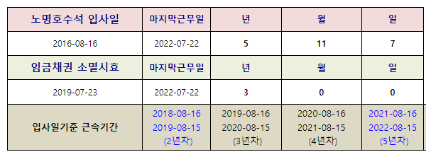 과거직전 3년치 미사용연차수당 계산했습니다. 임금채권 소멸시효 과거종료일 2019-07-23일 걸쳐있는