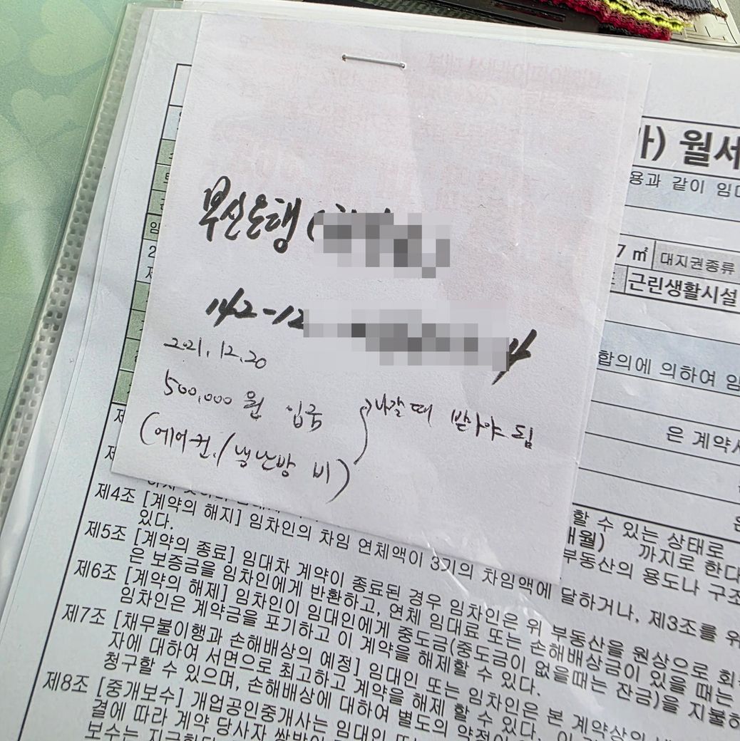 50만원 입금날짜와 "다음사람에게 받아야 됨' 이라고 메모까지 하여 계약서에 스탬플러로 찍어뒀어요.