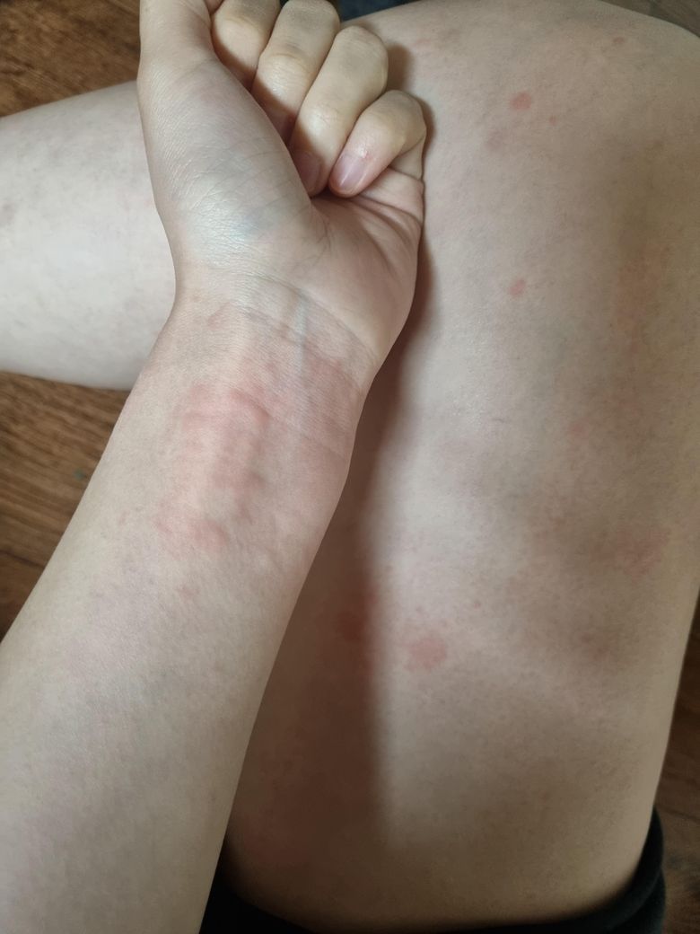 조금 간지러웠는데 그러다 말겠지 하고 지나쳤는데 소보루빵 위에 쿠키처럼 두드러기가 커지고 너무 간지러워서 피부과에 갔고 약을 처방 받았으나 효과가 없습니다