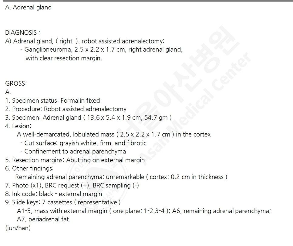 올려주신 결과지로 미루어 우측 부신을 로봇 수술로 제거한 상태로 신경절 신경종이 잔여 병변 없이 깨끗하게 제거된 상태로 생각됩니다.