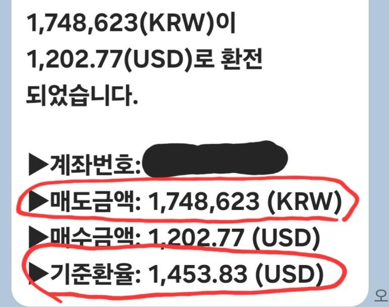 나중에 키움에서 환전되었다는 내용을보니 매수당시와 다르게 매수액도 1,202.77달러로 매수되었고 환율이 1,453.83이 적용되어서 원화 1,748,623이 출금되었다고 연락이 왔습니다.