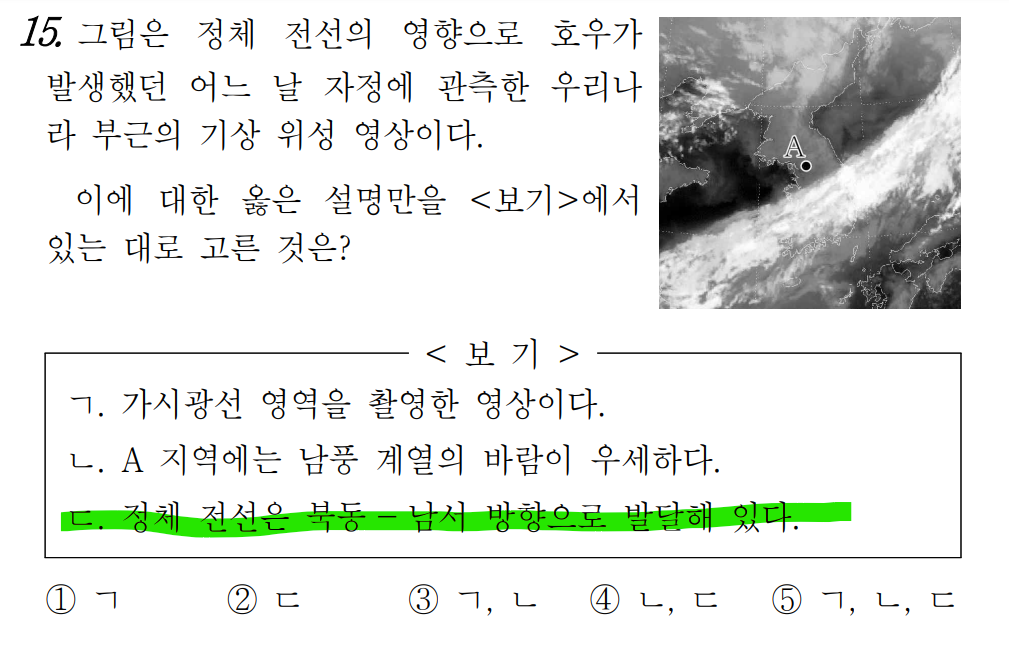 ㄷ 보기를 보면 의 문제의 기상 위성 사진의 정체전선이 북동 - 남서 방향으로 발달하였다고 하는데 이를 어떻게 알고 확정할 수 있는지 궁금합니다. "어째서 남서- 북동 방향으로는 발달했다고 하지 않는가?" 와 같은 맥락의 질문이라고 생각하셔도 괜찮습니다.