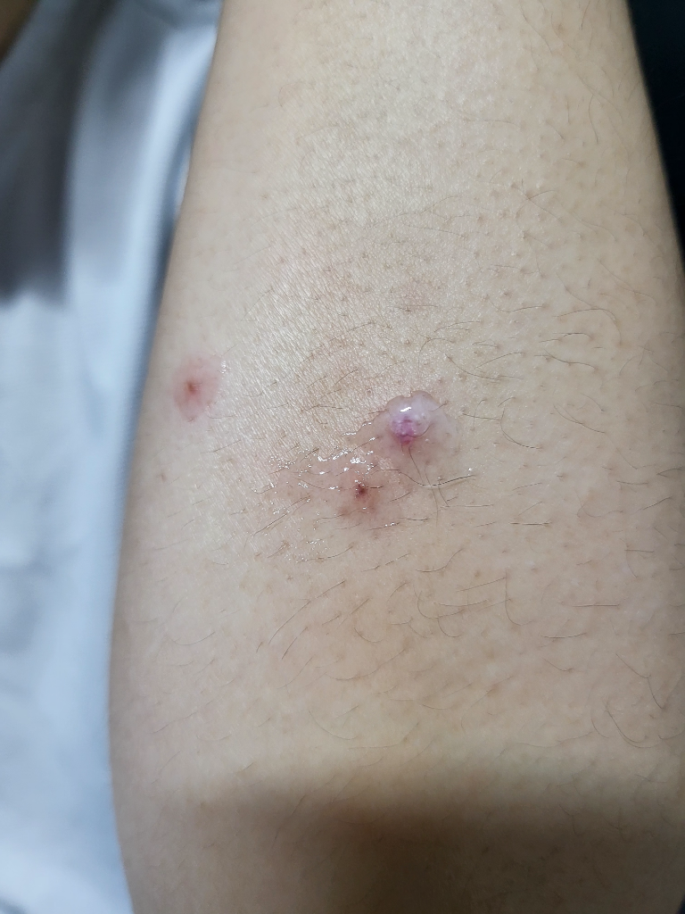 사진의 소견을 통해서 구체적인 감별 진단이 가능하지는 않습니다. 그렇지만 모낭염 같은 문제에 의한 병변이 아닐까 싶습니다. 관련하여서는 하고 계신 대로 관리를 해 보시고 호전되지 않는다면 피부과에서 처방을 받아서 치료하시길 권고드립니다.