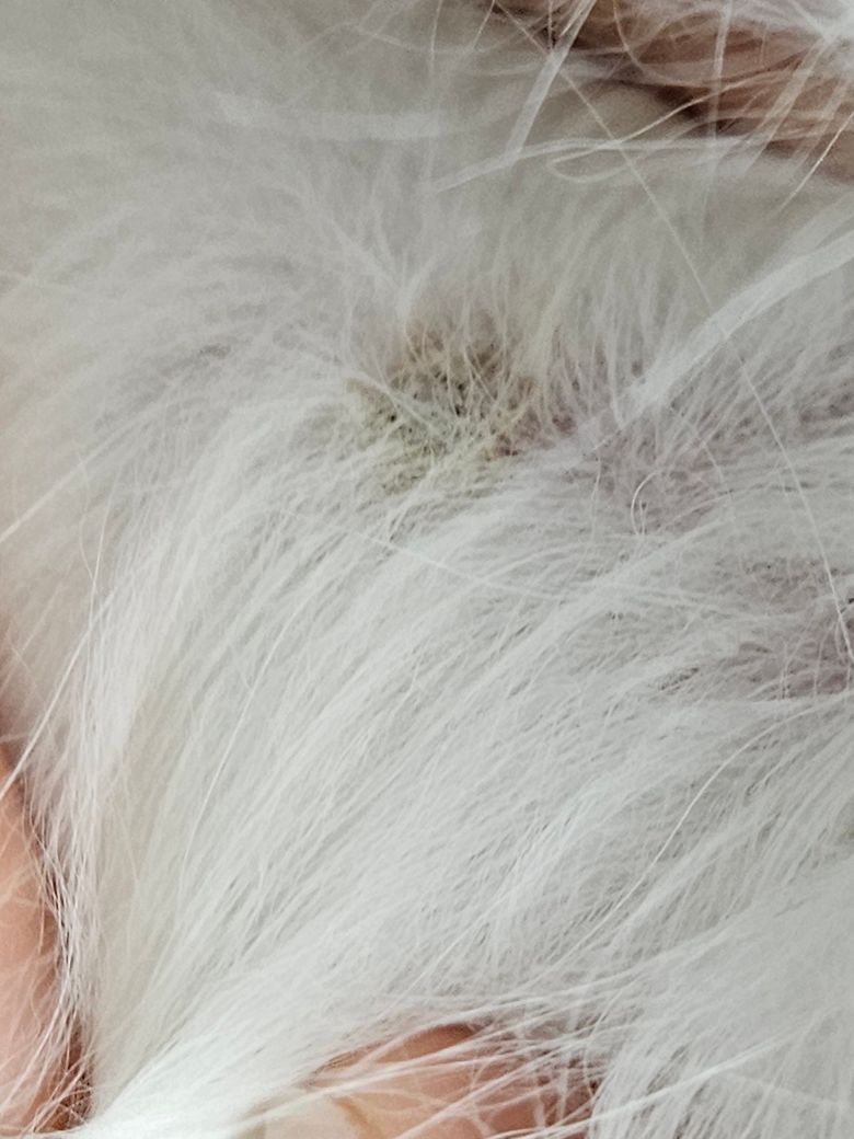 딱지와 털에 의해 피부 자체가 관찰되지 않아 원인 평가는 할 수 없습니다. 원발원인에 의해 발생한 딱지이기 때문에 병원에 가서 확인해야 합니다.