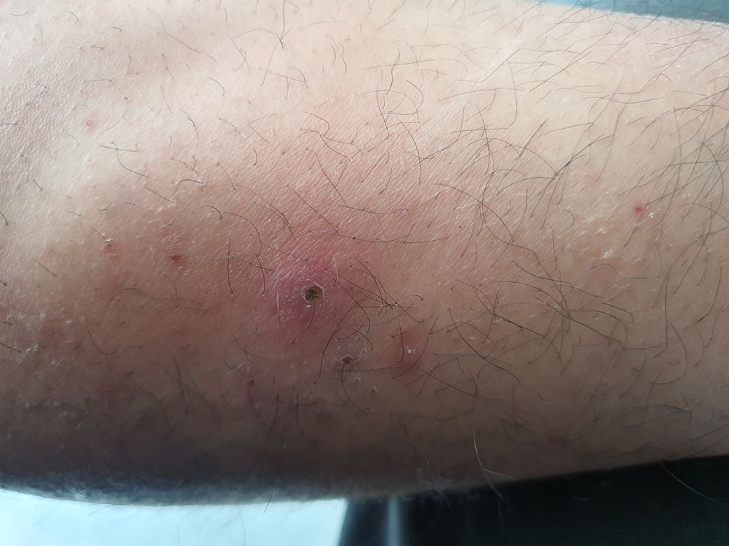안녕하세요 얼마전에 벌레 물린데 너무 긁다가 피가 난후 딱지가 앉았습니다 그리고 일주일정도 지나고 식당 의자에 앉다가 딱지쪽을 박았는데 너무 아파 걷어서 확인해보니 주위에 여드름 처럼 붉은반점이 생겼습니다 그리고 걷다보면 통증이 계속 옵니다 제가 느끼기엔 봉와직염인것 같은데 맞나요?