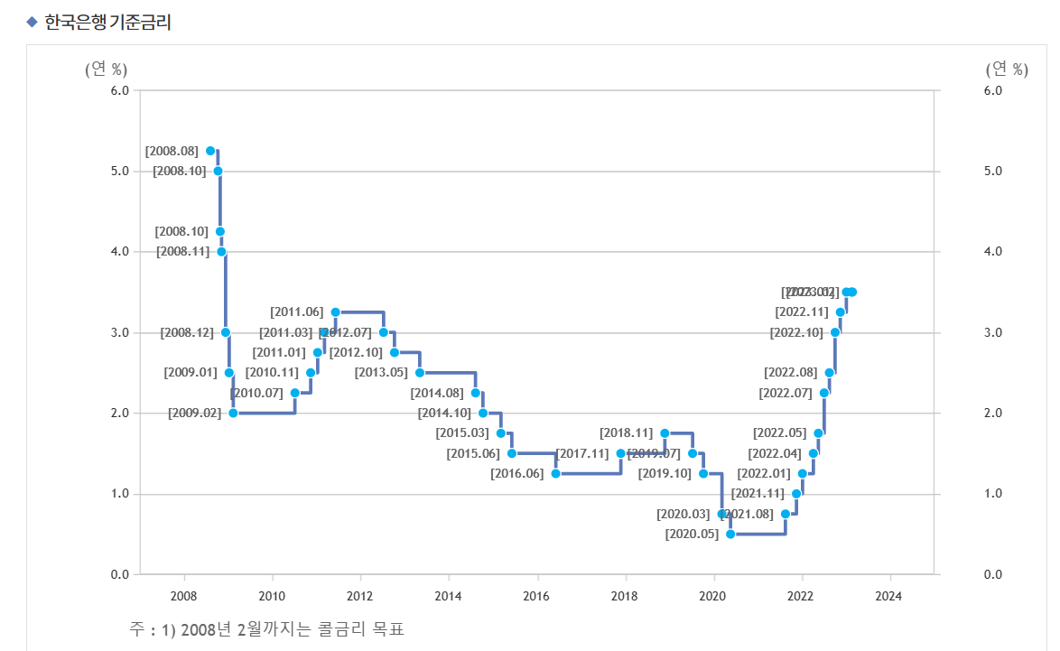 2008년 2월을 기점으로 우리나라에서도 '기준금리'라는 표현을 사용하기 시작하였으며 이전에는 '콜금리'가 기준금리를 대체하고 있었습니다. 다음 사진은 2008년도 이후의 우리나라 기준금리 현황을 나타낸 사진입니다.