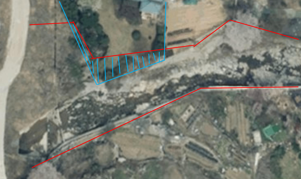 빨간선으로 칠해진 부분은 국유지(하천-행정자산)입니다.