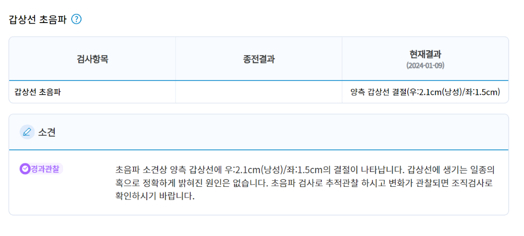 초음파를 판독한 의사는 양성병변으로 보고 추적관찰을 권고한 것이라 추정됩니다. 걱정스러우신 경우에는 해당 초음파 결과를 가지고 갑상선외과를 찾아가 상담받아보시면 되겠습니다.