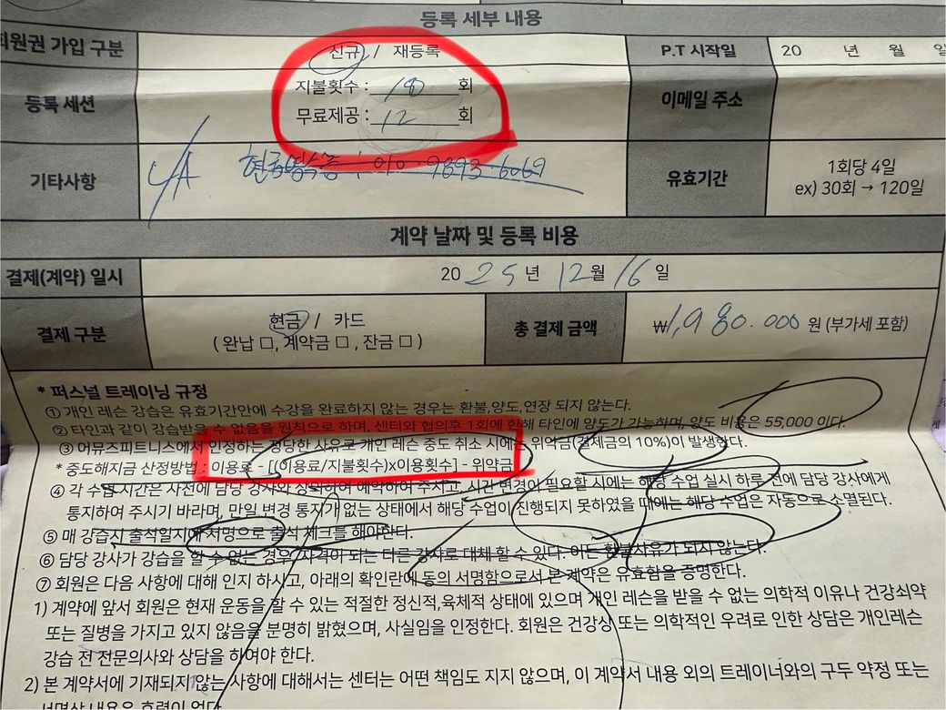 30회(회당 65,000원으로 안내받음)를 등록했는데 왜 지불횟수가 18회이고 무료가 12회인지…