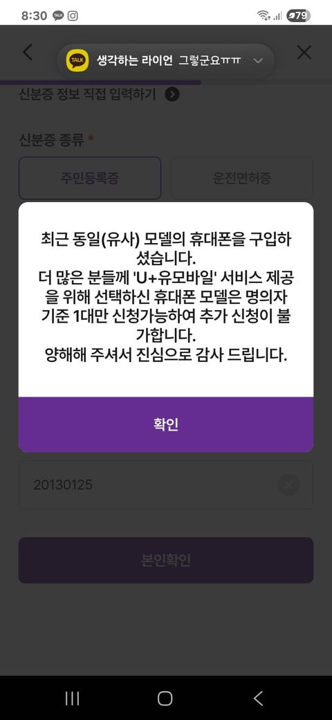 약정 기간이 다 해서 s22→s23+로 기기를 변경하려고 하는데 사진에 이미지에 "최근 동일(유사) 모델의 휴대폰을 구입한 셨습니다. "라고 떠서 구매한 전력이 없는데 왜 그러지라는 의문과 당황을 같이 겪게 되어 조회를 해서 신청을 취소하고 다시 구매 절차를 밟고 싶은데 원인이 뭐고 해결 방법 좀 알려주세요. 급합니다.