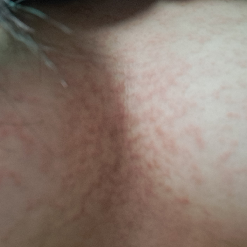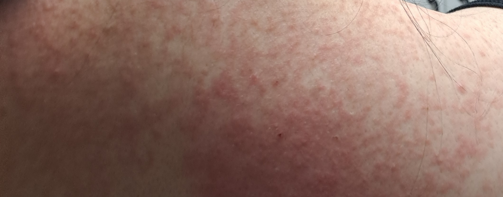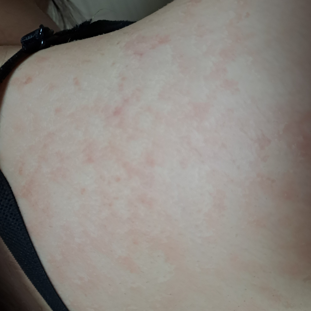 전신적인 두드러기성 병변이 보이는 상황입니다. 당장은 알레르기약을 복용하시고 날이 밝으면 피부과를 방문하시기 바랍니다.