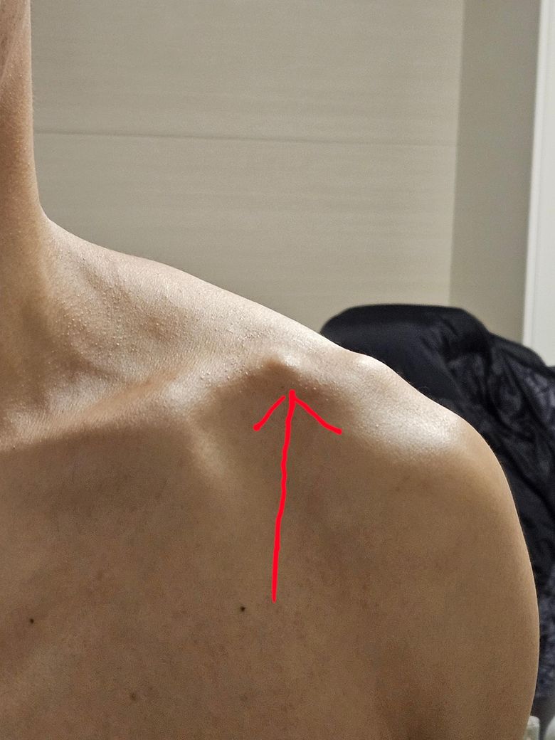 첫째, 쇄골–견봉 관절(acromioclavicular joint) 돌출 또는 관절 주변 낭종입니다. 어깨를 많이 쓰는 경우 관절이 비후되거나 소낭종이 만져질 수 있습니다. 통증 없이 단단하게 만져지는 경우가 흔합니다.
