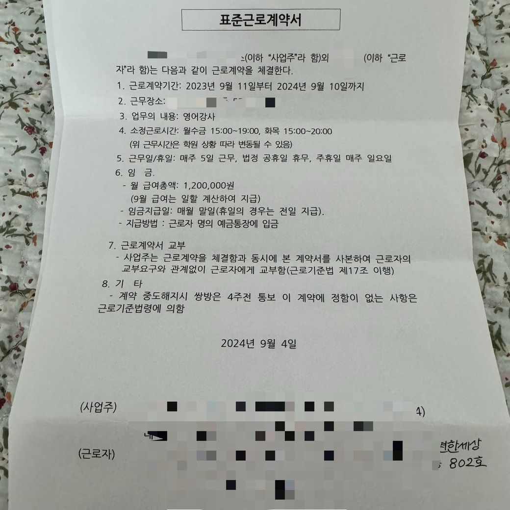 안녕하세요. 저는 대학생 때 알바로 시작한 학원에서 지금까지 일을 해오고 있습니다. 일을 하다 보니 지금은 전임 강사로 일하고 있는데요, 이번달 말까지 근무하기로말씀드린 상태입니다.