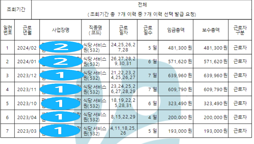 저는 5월까지 근무를 햇으며 주휴수당을 받으며 100정도를 받앗던 기억이있으나 제가 조회한 내역서는 너무 다르고 뭣보다 근무일수가 너무 적습니다
