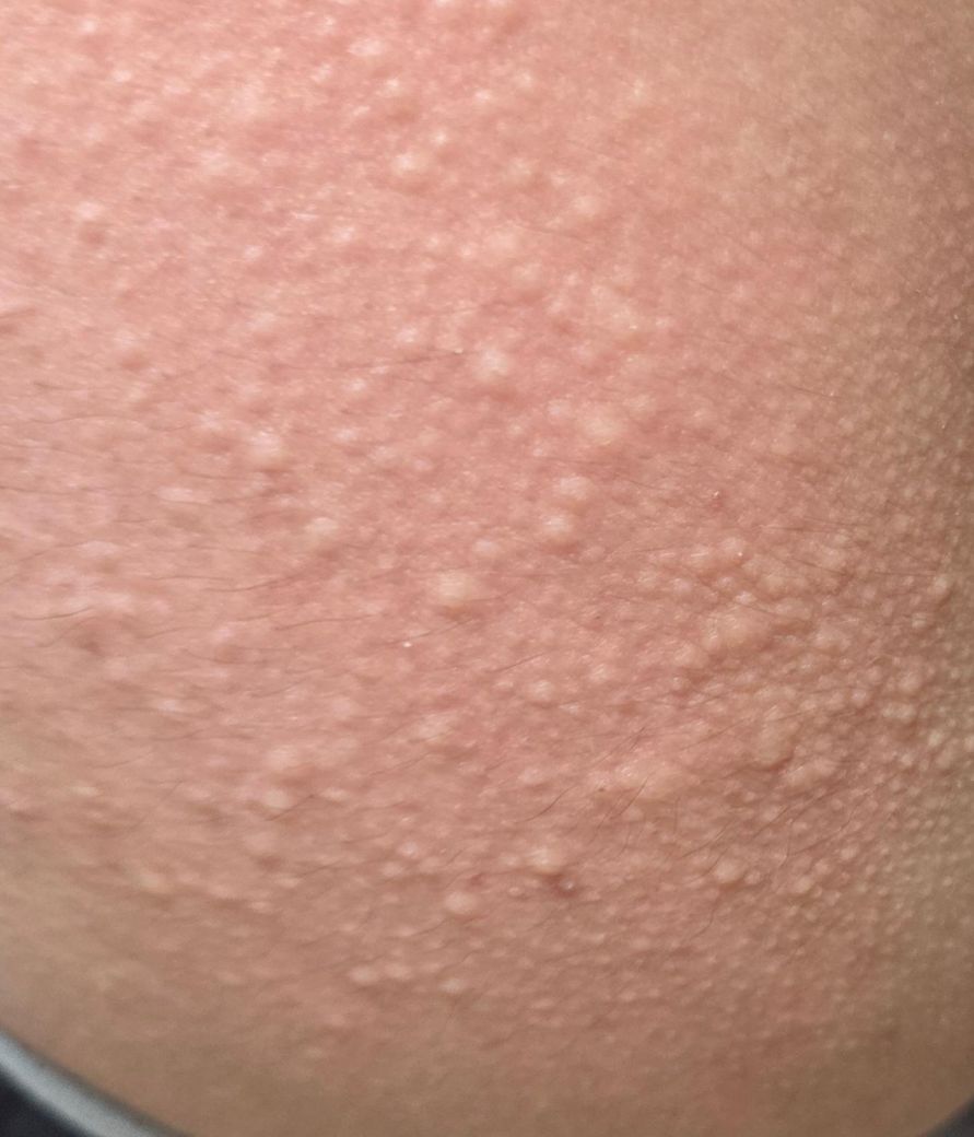 사진을 통해서 보았을 때에는 두드러기성 피부 병변이 있어 보입니다. 해당 소견만으로 그 원인이 무엇인지 어떠한 이유에서 발생한 것인지 파악 및 감별을 하는 것은 가능하지 않습니다. 보통은 알러지 반응과 관련이 깊으며 무언가 잘못 먹거나 접촉을 한 것에 의한 증상일 가능성을 고려해볼 수 있습니다. 각설하고 일단은 항히스타민제 등 투약을 통해서 증상을 조절하고 완화시켜보는 것이 적절하겠으며, 증상이 지속되는 양상이라면 피부과적으로 구체적으로 진료 및 치료를 받아보는 것이 도움이 될 수도 있겠습니다.