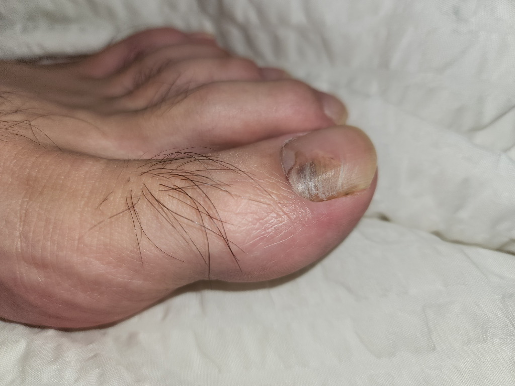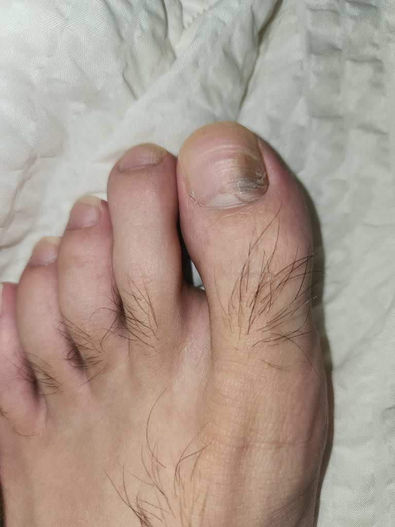 현재 병변 모양으로 보아 무좀으로 진단가능한 상태는 아니며, 그보다는 발가락 아래쪽으로 혈종이나 피가 차 있을 가능성이 있어보이는 상태입니다. 근처 정형외과 또는 피부과에 가셔서 의사의 정확한 진단을 받아보시기 바랍니다.