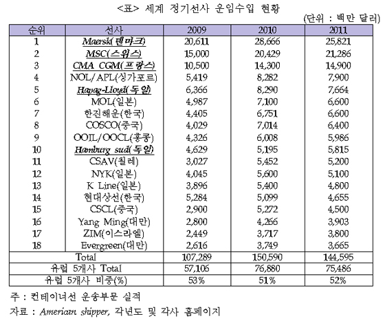 대표적인 유럽 해운회사는 덴마크 Maersk, 스위스 MSC, 프랑스 CMA CGM, 독일의 Hapag-Lloyd와 Hamburg Sud등 5개 기업이 있으며, 국내 해운회사도 유럽 쪽 항로로 다수 운영하고 있는 점 참고하여주시기 바랍니다.