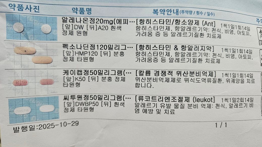 알레나온정(에피나스틴)과 펙소나딘정(펙소페나딘)은 탈모 보고가 매우 드문 편이며, 케이캡정(테고프라잔)도 탈모와의 연관성이 낮습니다. 반면 씨투원정(류코트리엔 조절제)은 드물게 탈모 사례가 보고되어 모놀레어정에서 교체 후 악화되었다면 1차 의심 약물로 봅니다. 방법은 항히스타민과 케이캡은 유지하고 씨투원정을 2~4주 중단하거나 기존 모놀레어로 되돌려 반응을 비교해 보는 것입니다. 변화가 없거나 계속 빠지면 갑상선 기능, 철·페리틴, 급격한 체중변화와 스트레스 등 다른 원인을 함께 평가해 보시길 권장드립니다. 갑사합니다.