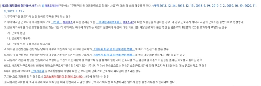 근로자퇴직급여보장법 시행령 제3조(퇴직금의 중간정산 사유) ① 법 제8조제2항 전단에서 “주택구입 등 대통령령으로 정하는 사유”란 다음 각 호의 경우를 말한다. <개정 2013. 12. 24., 2015. 12. 15., 2018. 6. 19., 2019. 7. 2., 2019. 10. 29., 2020. 11. 3., 2022. 4. 13.>