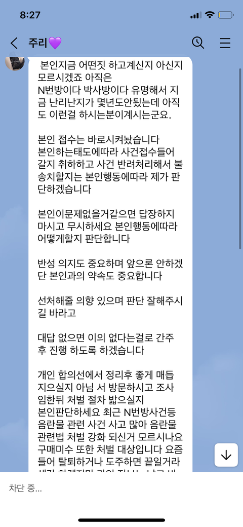 제가 sns에서 음란물 구매목적으로 연락을 취한것은 아닌데 라인으로 문자를 보냈거든요. 가격표문의 드린다고 보내고 그냥 이건 아닌거 같아서 죄송합니다 하고 나갔는데. 나중에 밑에 사진같이 문자가 오더군요 제가 성인이 아니라 무서워서 일단 차단하고 계정삭제후 지웠는데.. 처벌 신고 받나요?