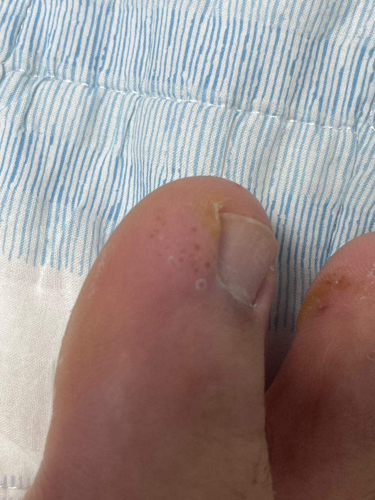 발가락과 손가락이 연관이 있을까요? 발가락만 국소적으로 생겼다면,, 크게 걱정할 문제는 아닐것 같습니다. 그 부위가 지속적으로 자극되면서 생겼을 수도 있겠습니다. 저절로 호전되는지 조금 지켜보시고, 지속되고 병변이 커지는 양상이라면 피부과 진료 고려해볼 수 있겠습니다.