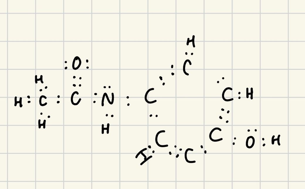 아세트아미노펜은 C8H9NO2의 화학식을 갖는 물질인데요, 올려주신 사진 속에서 전체적인 골격 구조는 잘 그리신 것 같습니다. 하지만 벤젠고리에 결합된 OH에서 O의 경우 2개의 결합을 이루고 2개의 비공유전자쌍을 가지고 있기 때문에 산소에 비공유전자쌍을 한 쌍 더 찍어주셔야 할 것 같습니다. 감사합니다.