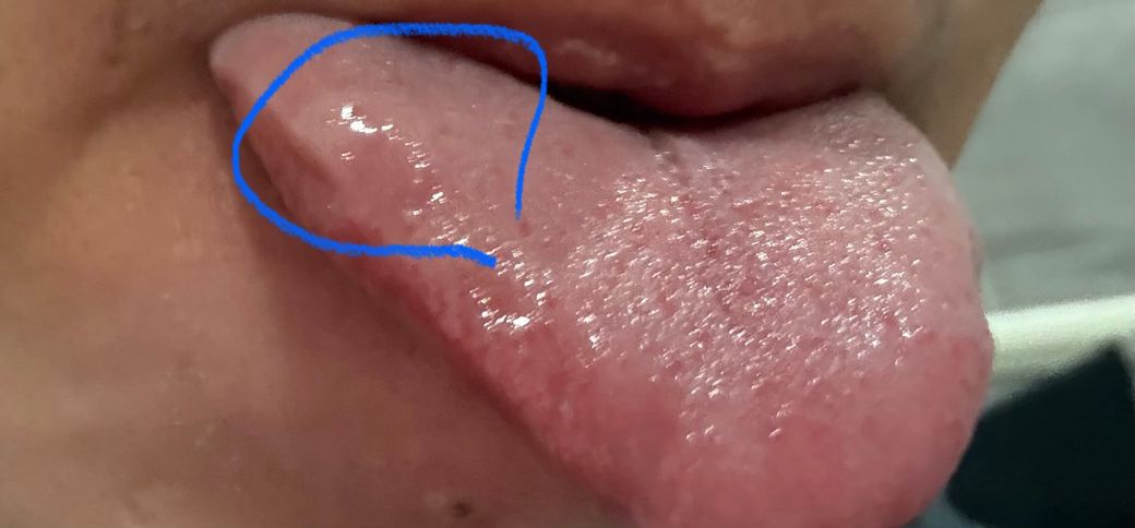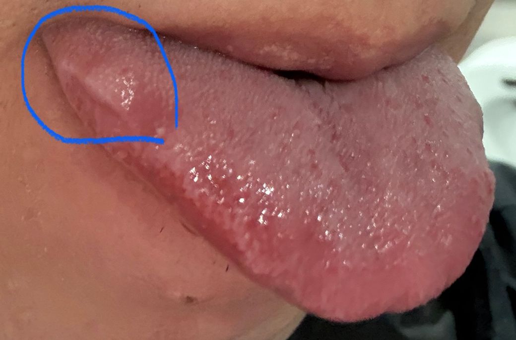 사진상 병변은 혀 옆면에 작고 둥근, 반투명한 흰색 돌기 형태로 보입니다. 주변 심한 궤양이나 출혈 없이 국소적으로 솟아 있는 점을 보면, 가장 가능성 높은 것은 일시적인 유두염(맛봉오리 염증) 또는 경미한 점액낭종입니다.