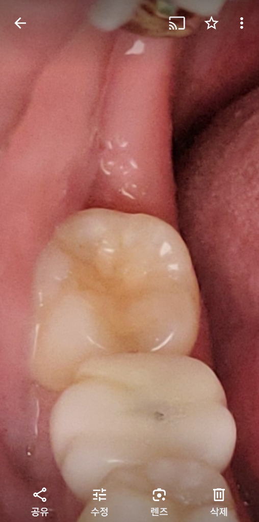 착색된 것으로 보이며 증상이 있으면 치과에 가보시는게 좋겠습니다