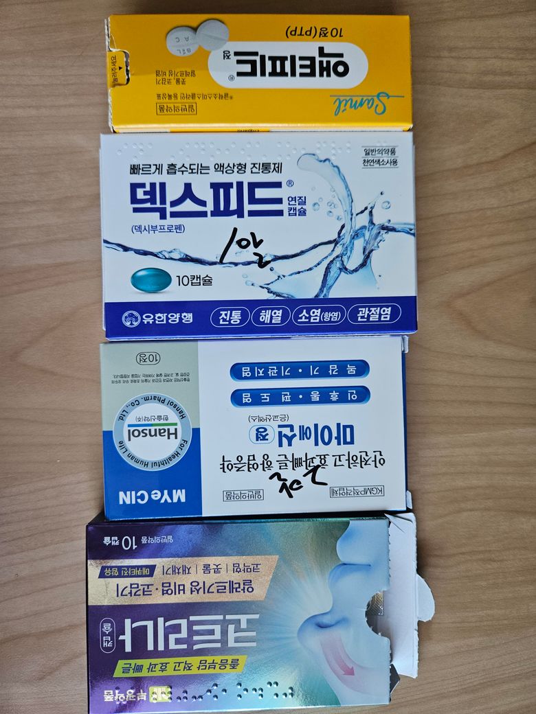 증상은 코막힘과 인후통이고 사진속 약들중에 같이 먹거나 병원에서 처방받은 약과 시간을 좀 두고 먹어도 되는 약이 있을까요?