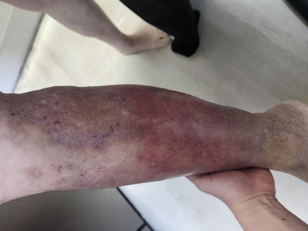 환부 상태: 다리 하단부에 넓은 범위의 붉은 붓기와 어두운 변색.