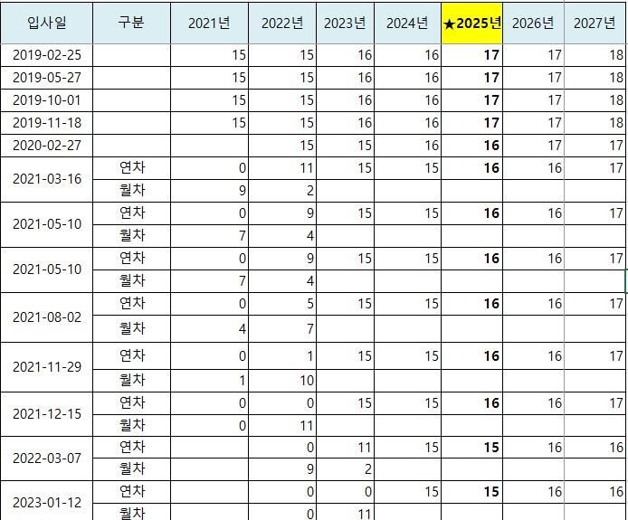 회계연도(1.1.~12.31.) 기준으로 연차 유급휴가를 부여하더라도, 계속근로기간이 1년 미만인 시점(입사일로부터 1년간)에는 매월 개근 시 1일의 유급휴가를 부여하여, 1년간 최대 11일의 유급휴가를 부여하여야 합니다(근로기준법 제60조 제2항 참조). 그리고, 만 3년 이상 근무 시 2년마다 1일씩의 가산휴가를 부여하여야 합니다. 단, 기본휴가 15일과 가산휴가를 포함한 유급휴가는 최대 25일이 부여될 수 있습니다(근로기준법 제60조 제4항 참조).