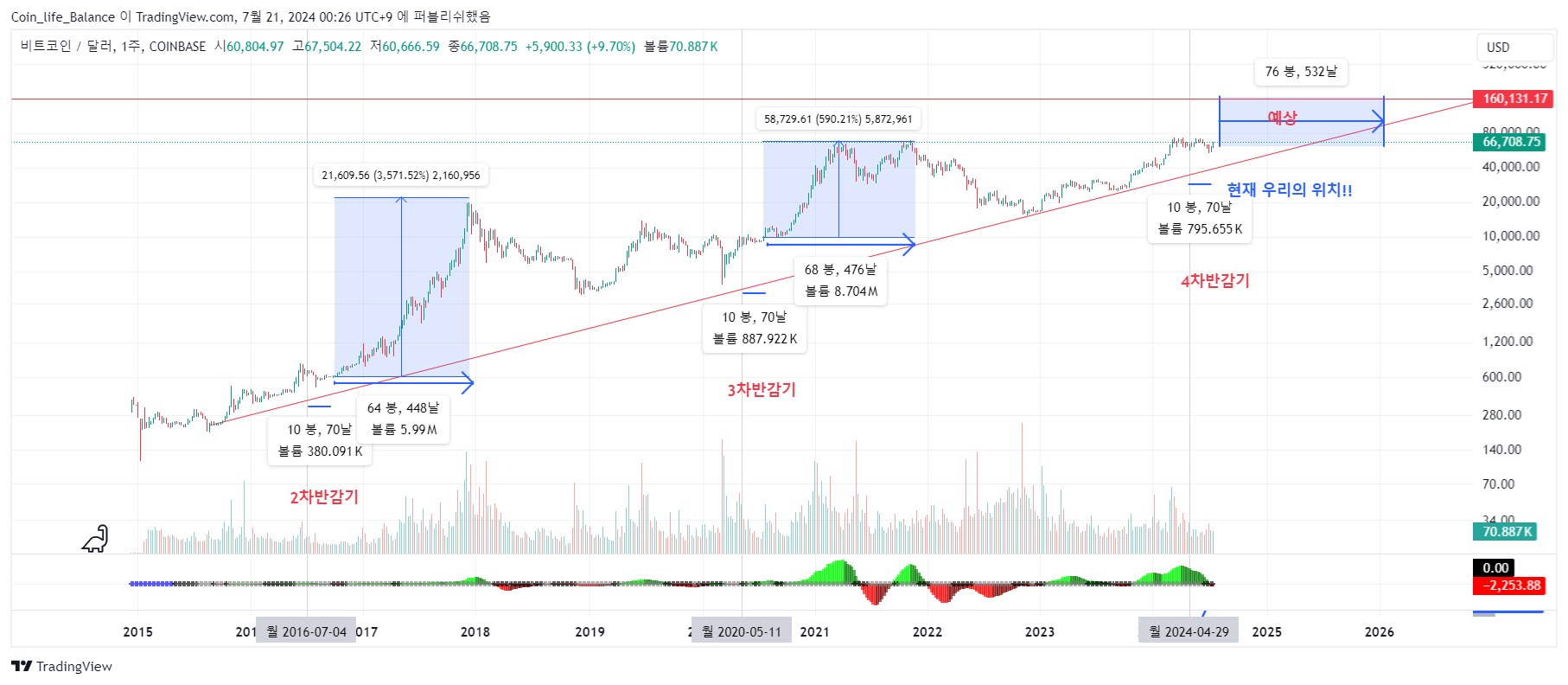 비트코인은 4년 주기설에 따라 약 4년마다 큰 가격 변동을 겪습니다. 현재 비트코인의 주간 가격 변동을 보면, 과거의 주기적 상승과 하락 패턴을 확인할 수 있습니다. 현재 비트코인은 다음 상승 주기를 준비하는 단계에 있는 것으로 보입니다.