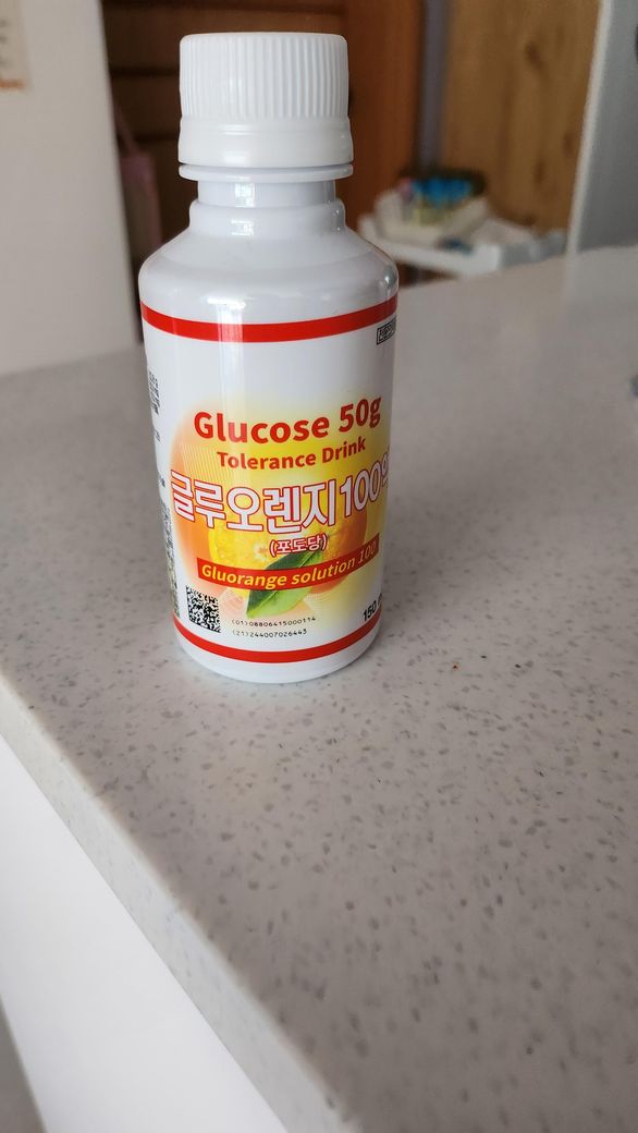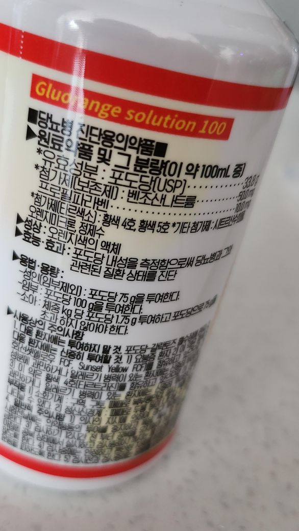 본래 임신성 당뇨 검사에서 100g 을 5분 이내에 전부 섭취하는걸로 알고있고 통에도 용법 - 임부 : 포도당 100g을 투여한다라고 적혀있습니다.