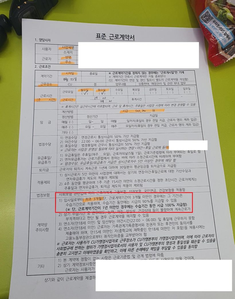 계약서를 보면, 3개월 미만인 경우에는 그 기간을 수습기간으로 적용해 90%만 지급하고
