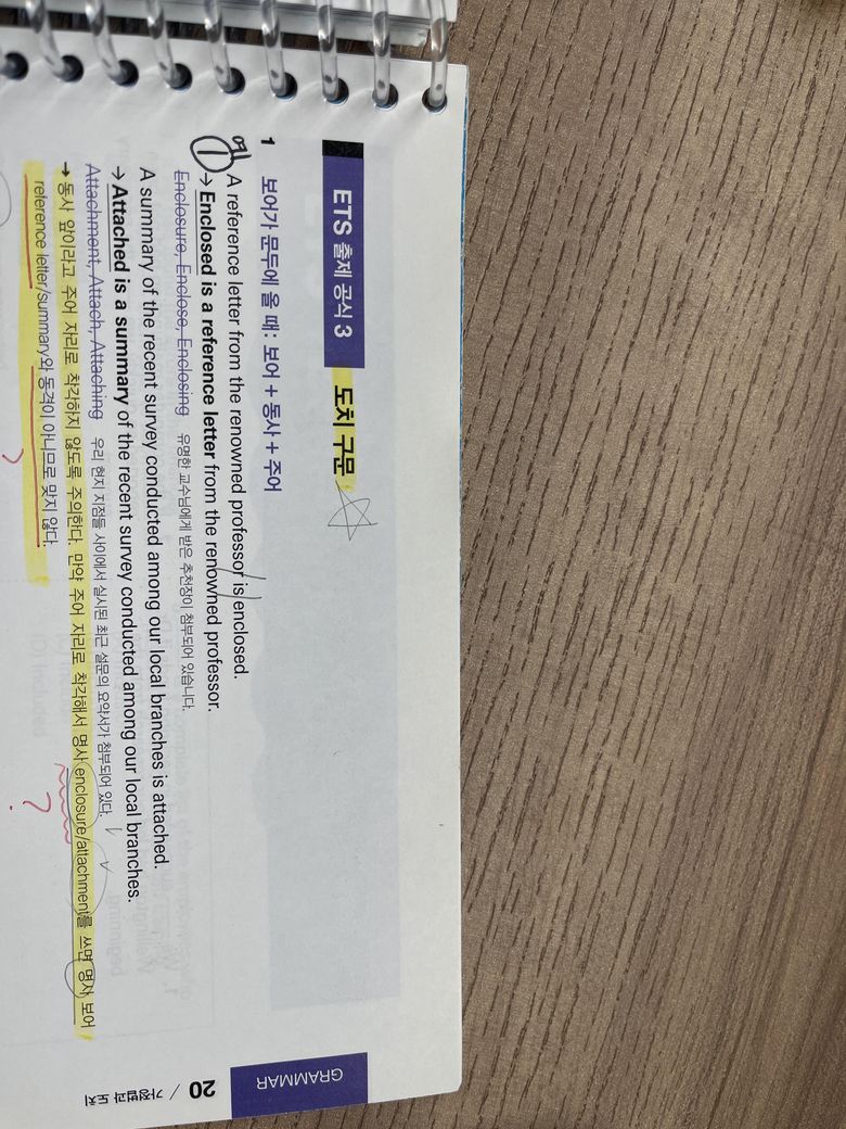 예시 1번 형광펜 칠한 곳 해답 보면, 주어 자리로 착각해서 enclosure을 쓰면 명사 보어 레퍼렌스 레터랑 동격이 됨으로 답이 안된다고 하는데… enclosure 뜻 찾아보면 동봉된 것 이라고 나오거든요 그럼, 동봉된것=추천장 동격이 될 수있는것 아닌가요..? 해석 : 동봉된 것은 교수님으로 부터 받은 추천장이다. 이렇게 안되나요???