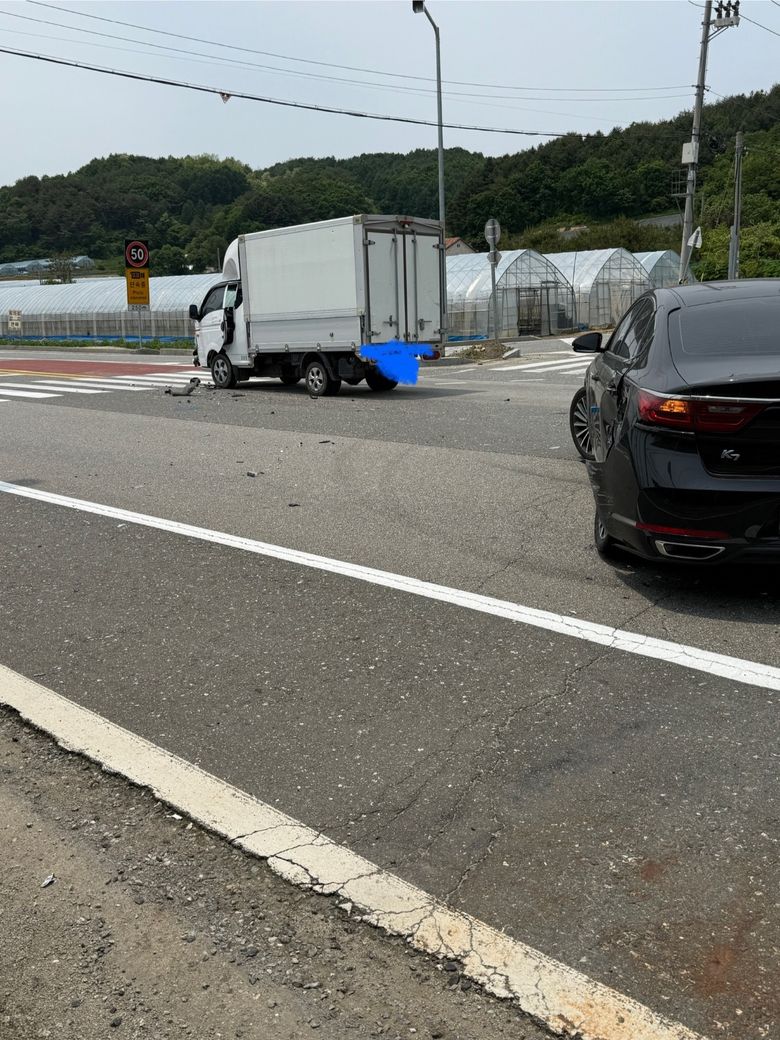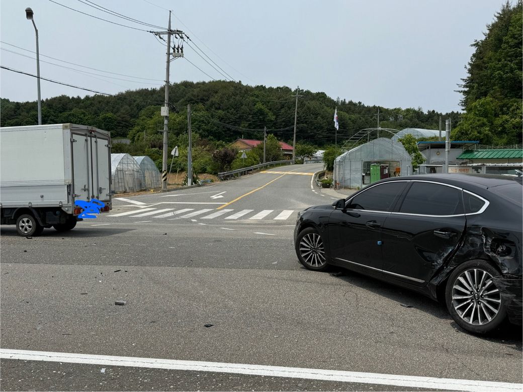 현재 좌회전 차량 운전자는 본인이 잘못한 부분을 인정하고 있는 상황입니다. 정지선에소 멈췄어야 하는게 맞는데 왼쪽 모퉁이 집이 시야가 가려 차가 오지 않다고 판단도 진입했습니다.. 또한 사고 당시 2차 사고를 방지하기 위하여 저와 함께 바로 내렸고, 직진 운전자에게 가서 응급차 여부와 함께 경찰에 사고 접수 및 처리를 했습니다.