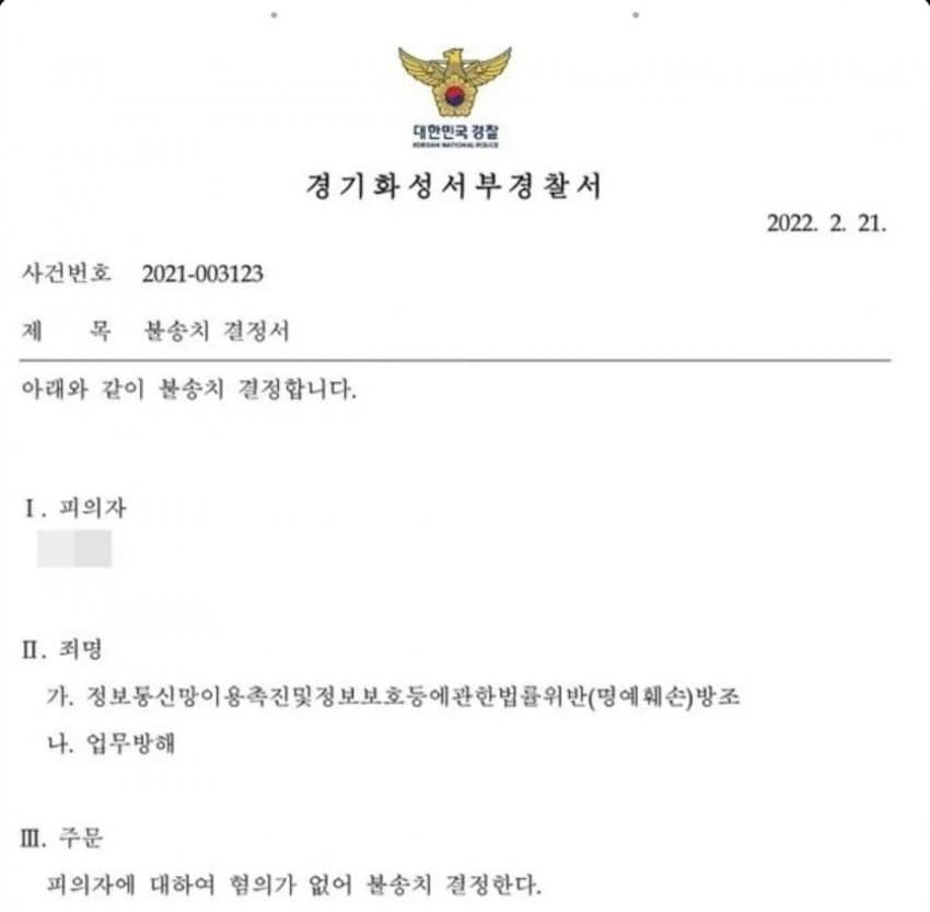 "경찰은 해당 사건에 대하여 폭로자의 입장에서는 진실일 수 있고 허위라는 고의가 없다는 이유 등으로 불송치