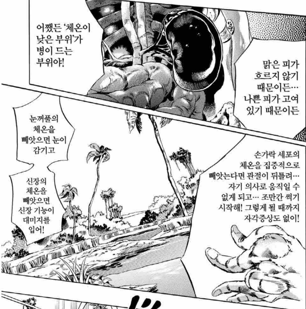 건강한 상태라면 하루 중 체온 변화는 약 0.5℃ 이내라고 합니다. 체온이 높으면 외사가 침범하여 염증 등이 생긴 상태로 급성질환이 생기기 쉽고 반대로 체온이 낮아지면 면역력이 현격히 떨어지고 기초대사가 떨어져서 삽화에서 열거한 증상들이 나타나게 됩니다. 중병에 걸릴수록 점점 체온이 낮아지고 자칫 나무코트를 입을 수도 있습니다.