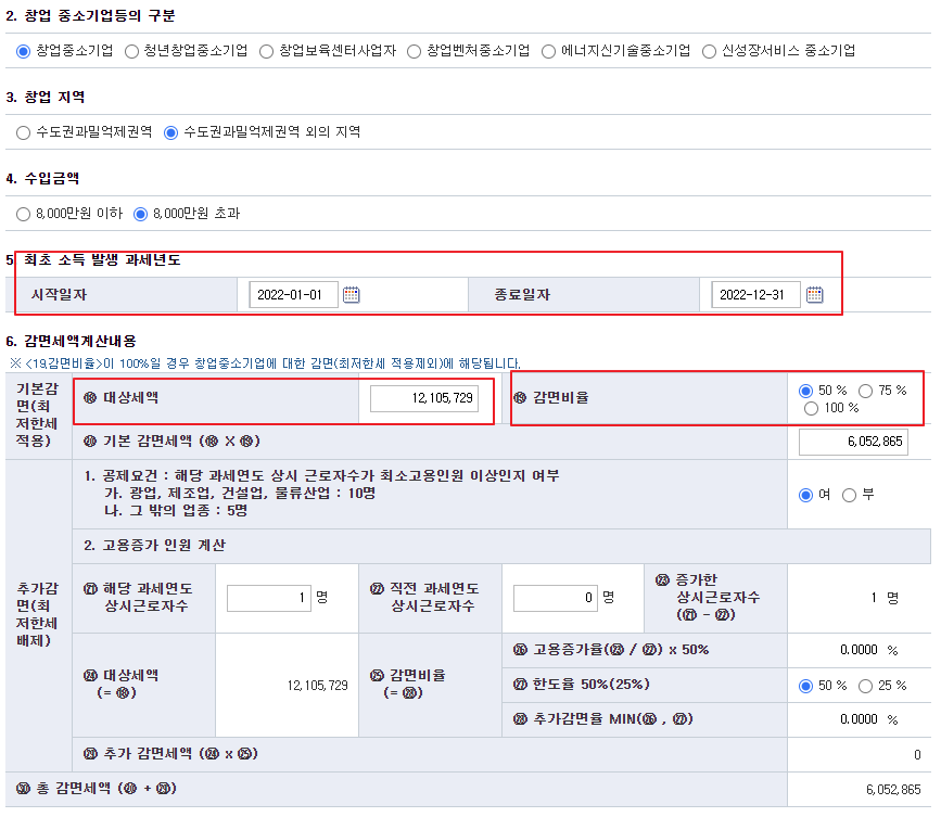 6.대상세액: 22년도 감면소득에 대한 산출세액을 기재하시면 됩니다.