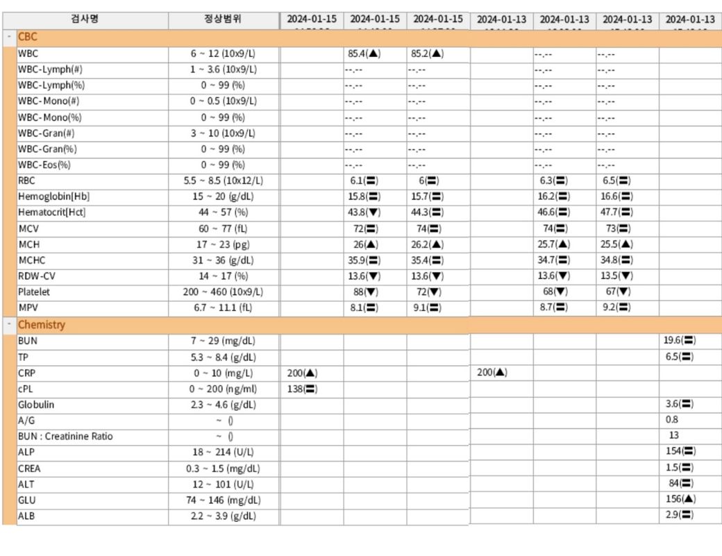 위와 같은 요인에 의해 심한 염증이 생기면 이렇게 고열에 임상증상까지 나타날 수 있습니다.