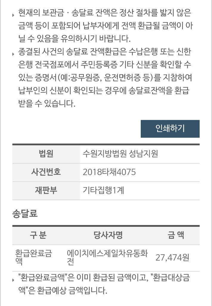 현재의 보관금ㆍ송달료 잔액은 정산 절차를 밟지 않은 금액 등이 포함되어 납부자에게 전액 환급될 금액이 아닐 수 있음을 유의하시기 바랍니다.