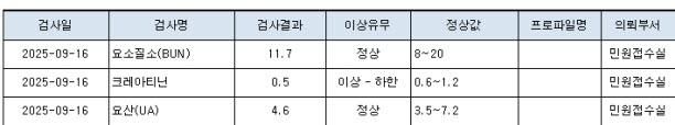 혈청 크레아티닌의 경우 신장기능을 반영을 하며 주로 수치가 높은 경우가 문제가 됩니다.