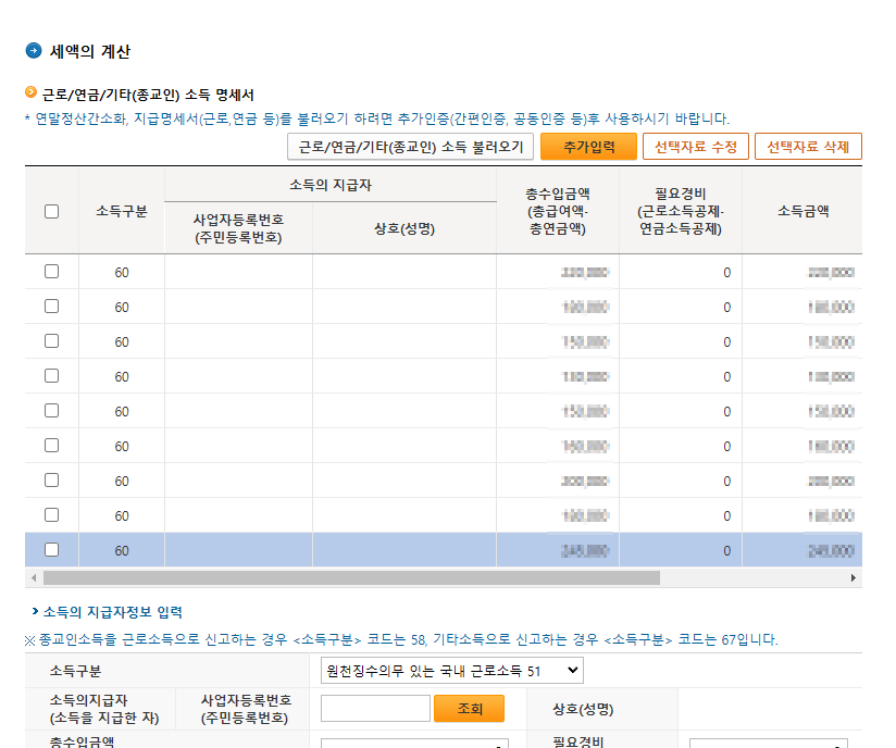 이런식으로 명세서를 건마다 추가해서 입력하는게 맞는지.. 연간 총 수입을 한번에 써도 되는지..