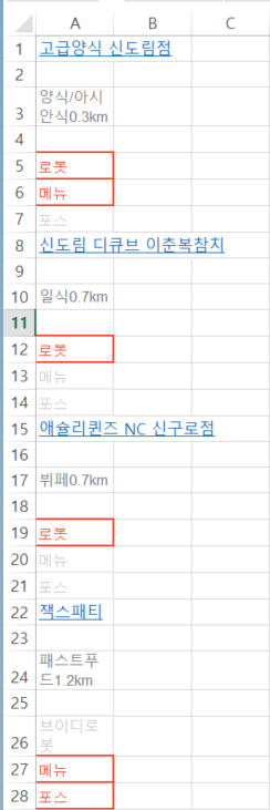 자료1에서 식당명이 7칸씩 차이나는 것을 활용하여, 전체 식당명을 가져올 수 있습니다.