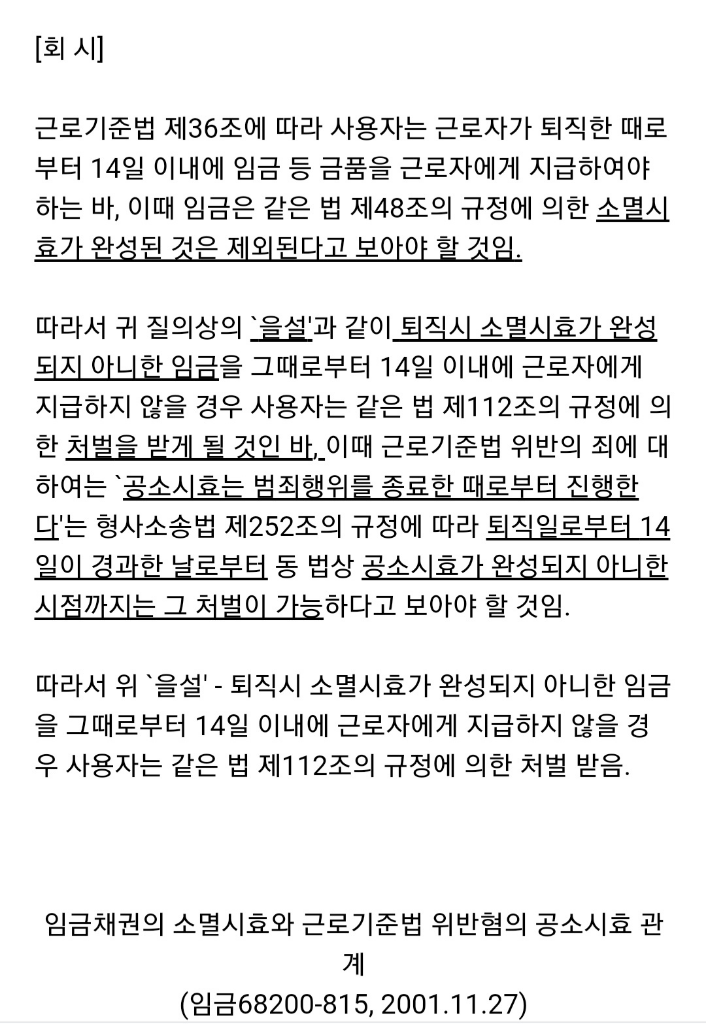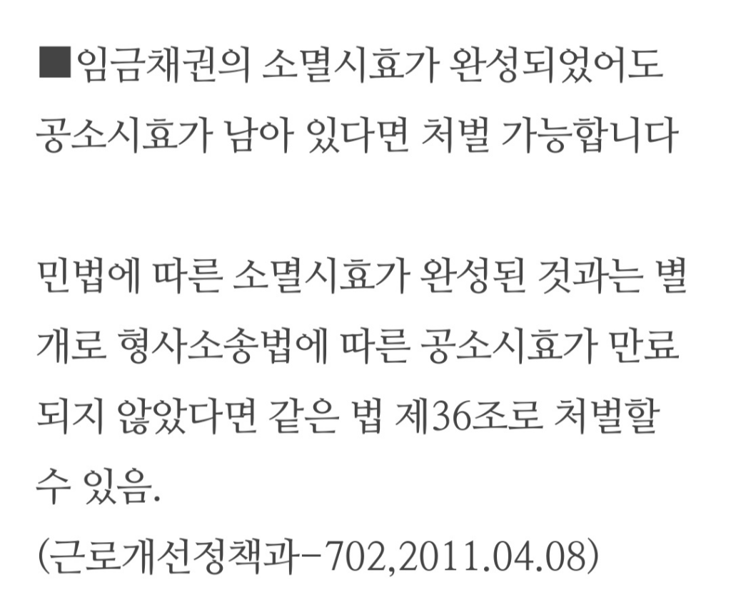 첫번째 사진의 경우, 임금채권 소멸시효가 완성됐어도 형소법상 공소시효가 완성되지 않았다면 처벌 가능하다는 의미이고