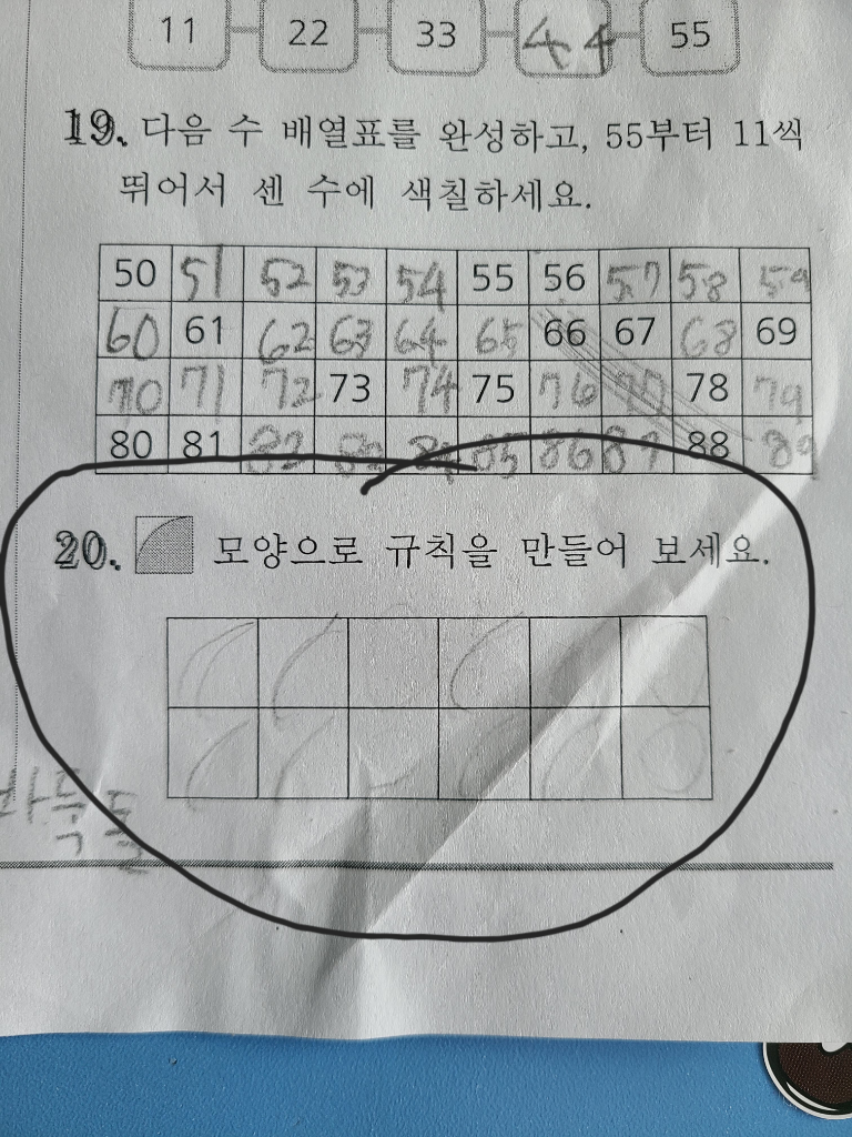 네개가 합쳐진 가운데점이 원의 중심이 되도록 위에 주어진 모양대로 네칸에 4분의1 크기의 원을 그려 넣으면 완성됐을때는 원이 되지요.