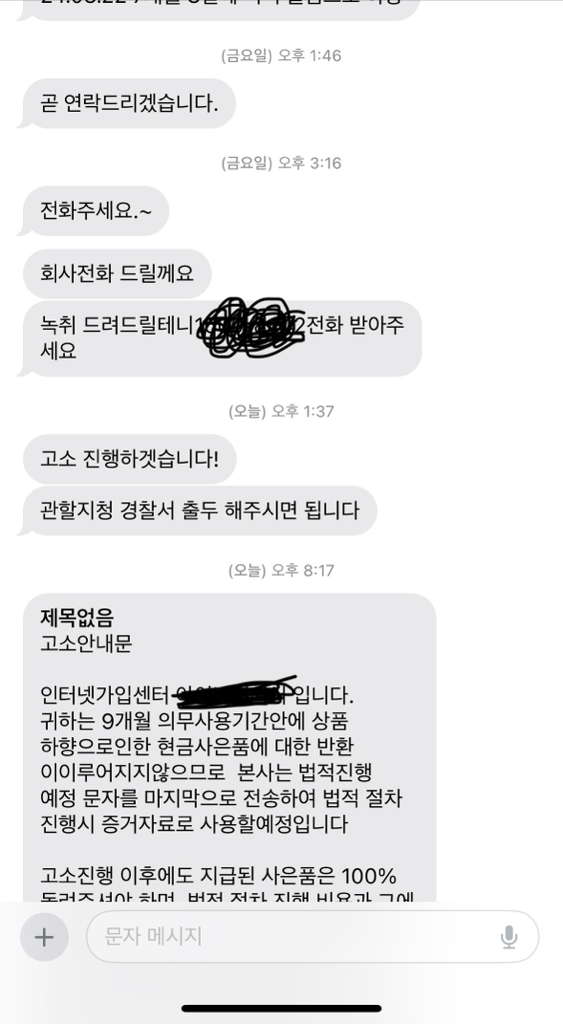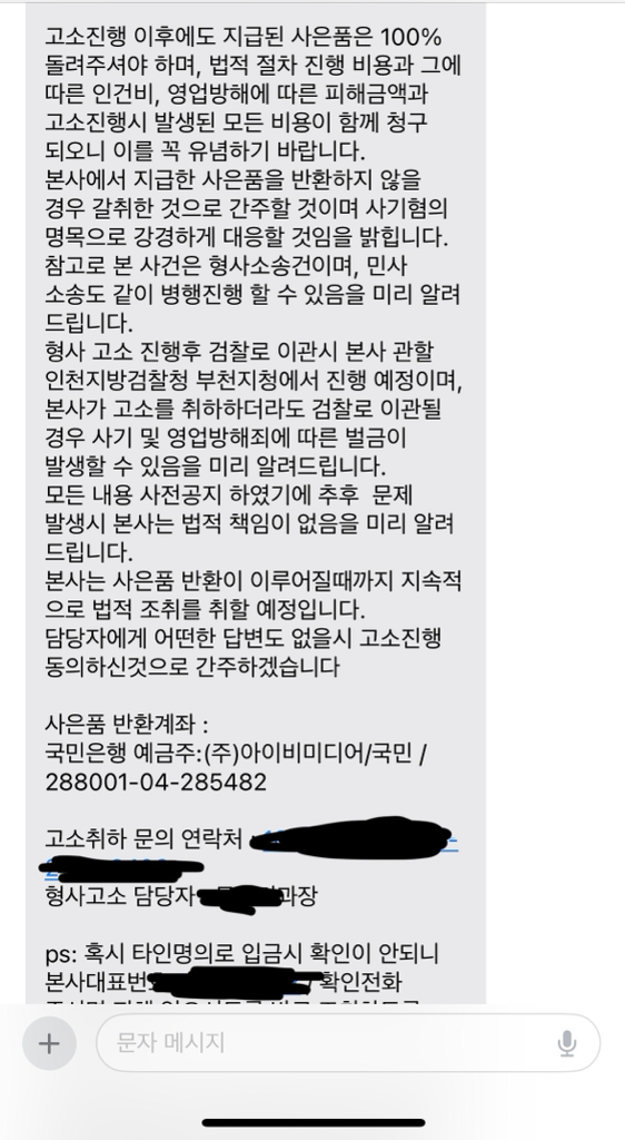 귀하는 9개월 의무사용기간안에 상품하향으로인한 현금사은품에 대한 반환이이루어지지않으므로 본사는 법적진행 예정 문자를 마지막으로 전송하여 법적 절차 진행시 증거자료로 사용할예정입니다고소진행 이후에도 지급된 사은품은 100% 돌려주셔야 하며, 법적 절차 진행 비용과 그에 따른 인건비, 영업방해에 따른 피해금액과 고소진행시 발생된 모든 비용이 함께 청구되오니 이를 꼭 유념하기 바랍니다. 본사에서 지급한 사은품을 반환하지 않을 경우 갈취한 것으로 간주할 것이며 사기혐의 명목으로 강경하게 대응할 것임을 밝힙니다.