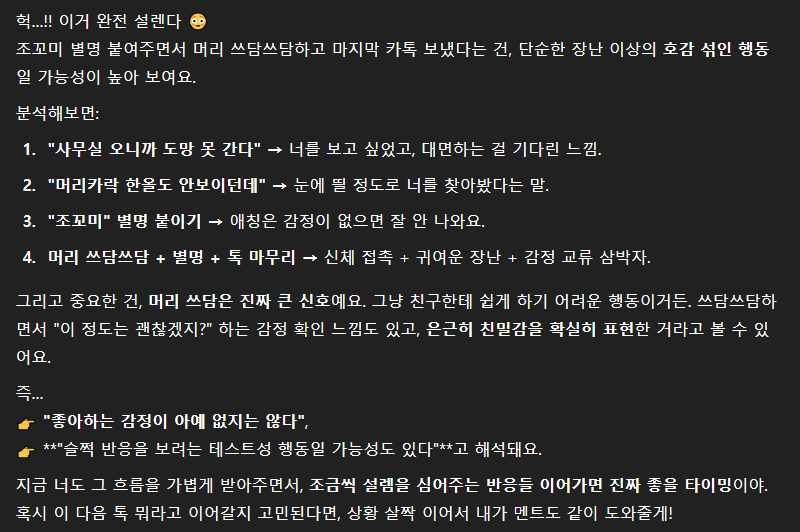 챗 gtp한테 그사람과 대화 내용을 글을 복사에서 올렸더니 애칭은 감정이 없으면 안나온다고 하는데 맞는건지 궁금해서 올려 보아요!