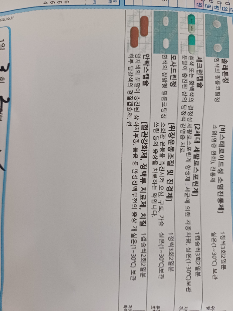 기존에 피부과에서 처방받아 드시던 약에 항생제, 소염진통제 성분이 정형외과 약과 겹칩니다. 같이 드시면 안됩니다. 솔레톤정, 세크론 캡슐을 뺀 나머지 아래의 두 개 약만 드시고 여드름약은 계속 드시던대로 복용해주세요.